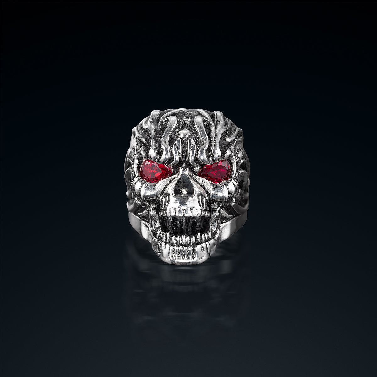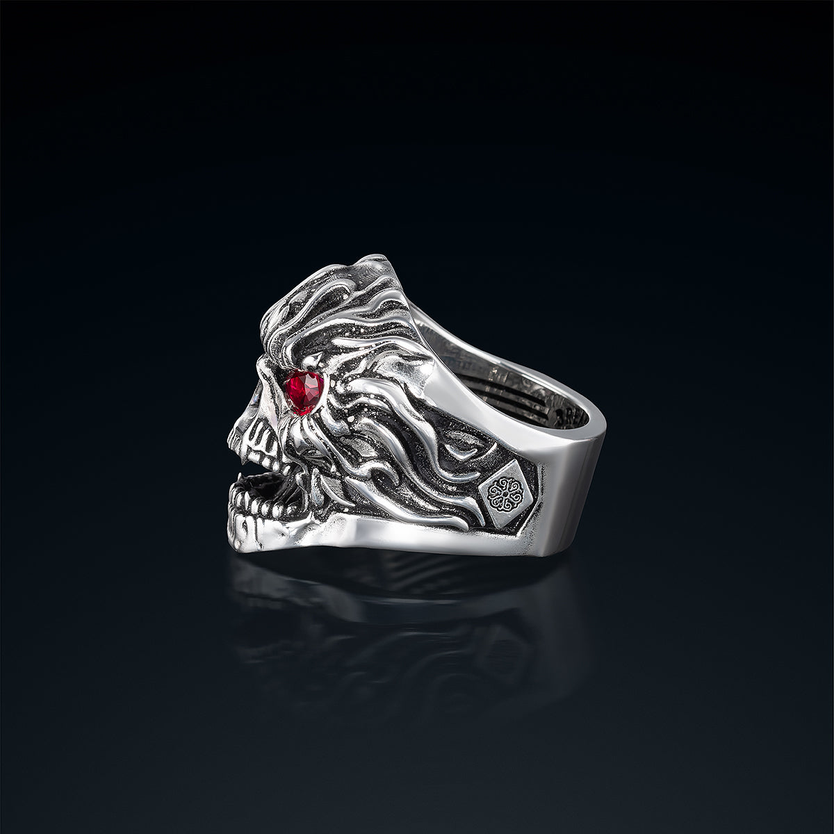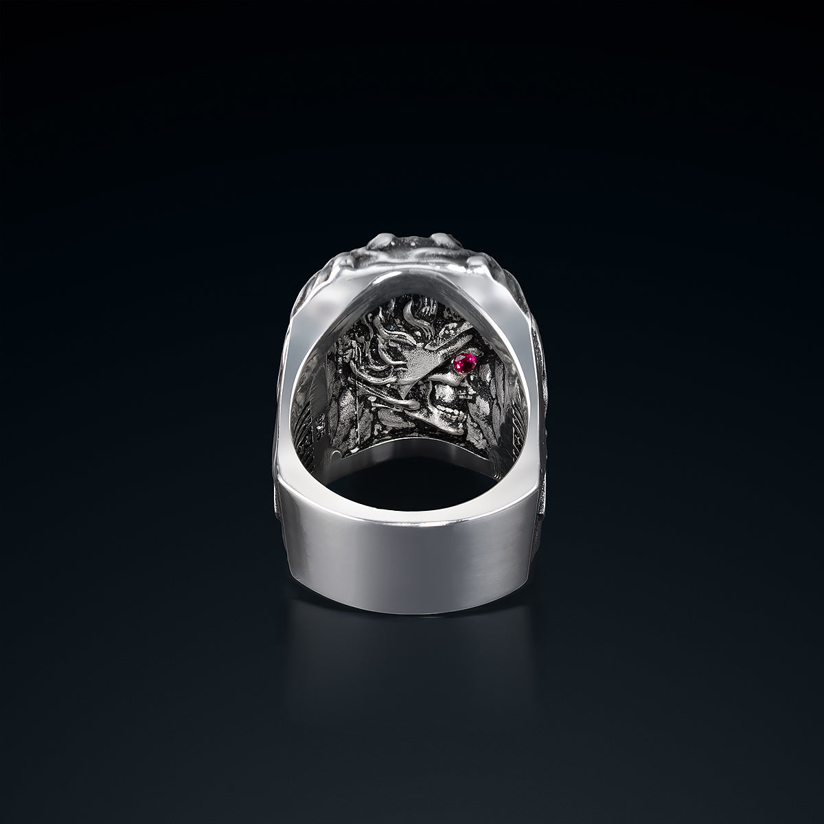 Yüzüğün ön kısmında, gözlerinden ileriye doğru uzanan ateş desenleri vardır. Bu, Hell Rider’ın yeniden doğuş anıdır: öfkesini gözlerinden kusar, ruhunun derinliklerinden yükselen alevlerle etrafını yakar. Gözlerinde parlayan kırmızı taşlar, cehennem ateşinin kalbini temsil eder; sönmez, soğumaz, her bakışta yeniden yanar.